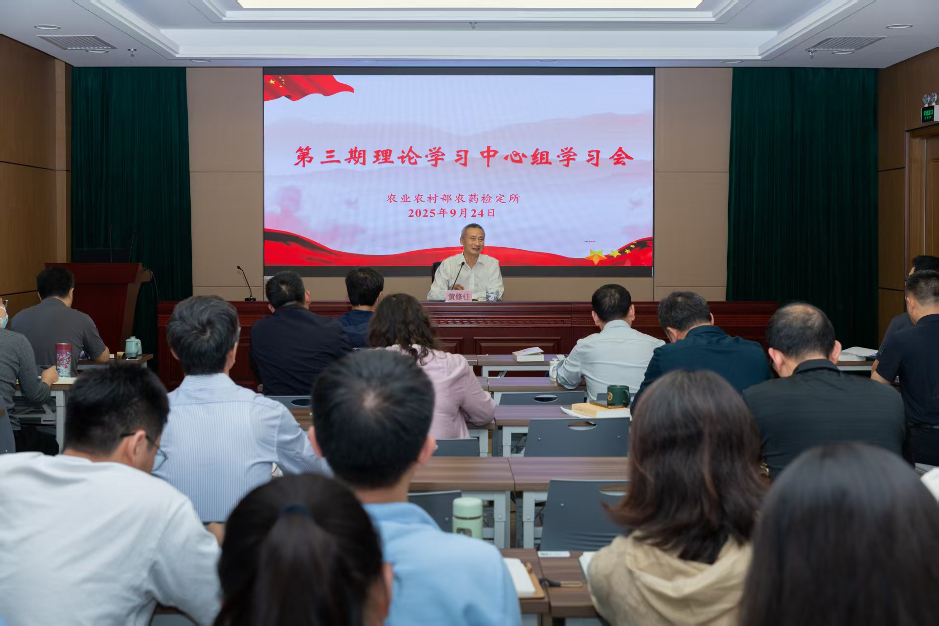 本网讯:9月22日—24日,农药检定所党委举办2025年第3次理论学习中心组(扩大)学习会,采取自学与集中学习研讨相结合的方式,认真学习《习近平谈治国理政》第五卷,围绕中国式现代化、进一步全面深化改革、扩大高水平对外开放、发展新质生产力、深入推进党的自我革命等专题,结合药检工作实际深入研讨,研究贯彻落实举措。全所共70余名党员干部参会学习,黄修柱同志主持会议并讲话。